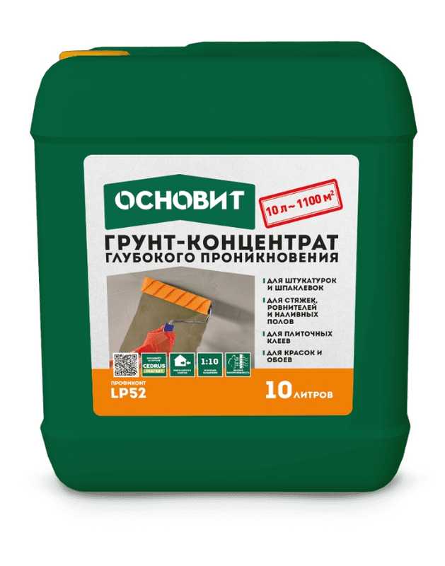 Грунт-концентрат глубокого проникновения ОСНОВИТ ПРОФИКОНТ LP52 предназначен для предварительной обработки и обеспыливания минеральных оснований. Применяется для подготовки поверхности под последующее нанесение отделочных материалов: штукатурок, шпаклёвок, стяжек, ровнителей, наливных полов, плиточных клеёв, гидроизоляции, лакокрасочных материалов. Для внутренних и наружных работ. Морозостойкий при хранении. Разбавляется водой в соотношениях 1:2; 1:3; 1:4; 1:5; 1:6; 1:8; 1:10.