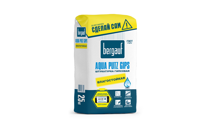 Штукатурка Bergauf Aqua Putz Gips влагостойкая гипсовая используется для выравнивания стен и потолков под оклейку обоями, покраску, наклейку плитки. Предназначена для внутренних работ с нормальной и повышенной влажностью. Поверхность основания должна быть очищена от грязи и пыли, лакокрасочных покрытий, отслаивающихся старых покрытий и масляных пятен — всего, что может ухудшить адгезию материала к основанию. Все трещины, глубокие выбоины в основании, пустые швы кирпичных кладок необходимо за сутки до начала проведения работ по оштукатуриванию расшить, очистить от пыли, обработать грунтовкой и заполнить густо разведённой смесью. Сухие и сильно впитывающие основания (например, ячеистый бетон) необходимо прогрунтовать 2 раза. Перед повторным нанесением первый слой грунтовки необходимо высушить в течение 1 часа. Работы по оштукатуриванию следует проводить не ранее чем через 4 часа. Бетон, железобетон и другие мало впитывающие основания рекомендуется обработать бетон-контактом. Типы оснований: ячеистый бетон, кирпичная кладка, бетон, железобетон, ячеистый бетон, газобетон, цементная, цементно-известковая, гипсовая штукатурка, гипсокартон, цсп, дсп, фанера, дерево. Порошок упакован в ведро на 25 кг. Состав смеси: гипс и полимерные добавки. Фракция — от 0,5 мм до 0,6 мм. Плотность — 1150 кг/м³. После высыхания создает гладкий слой. Срок годности — 1 год с даты изготовления. Хранить в оригинальной невскрытой упаковке, хранить вдали от мороза, тепла (не более +30 °C).